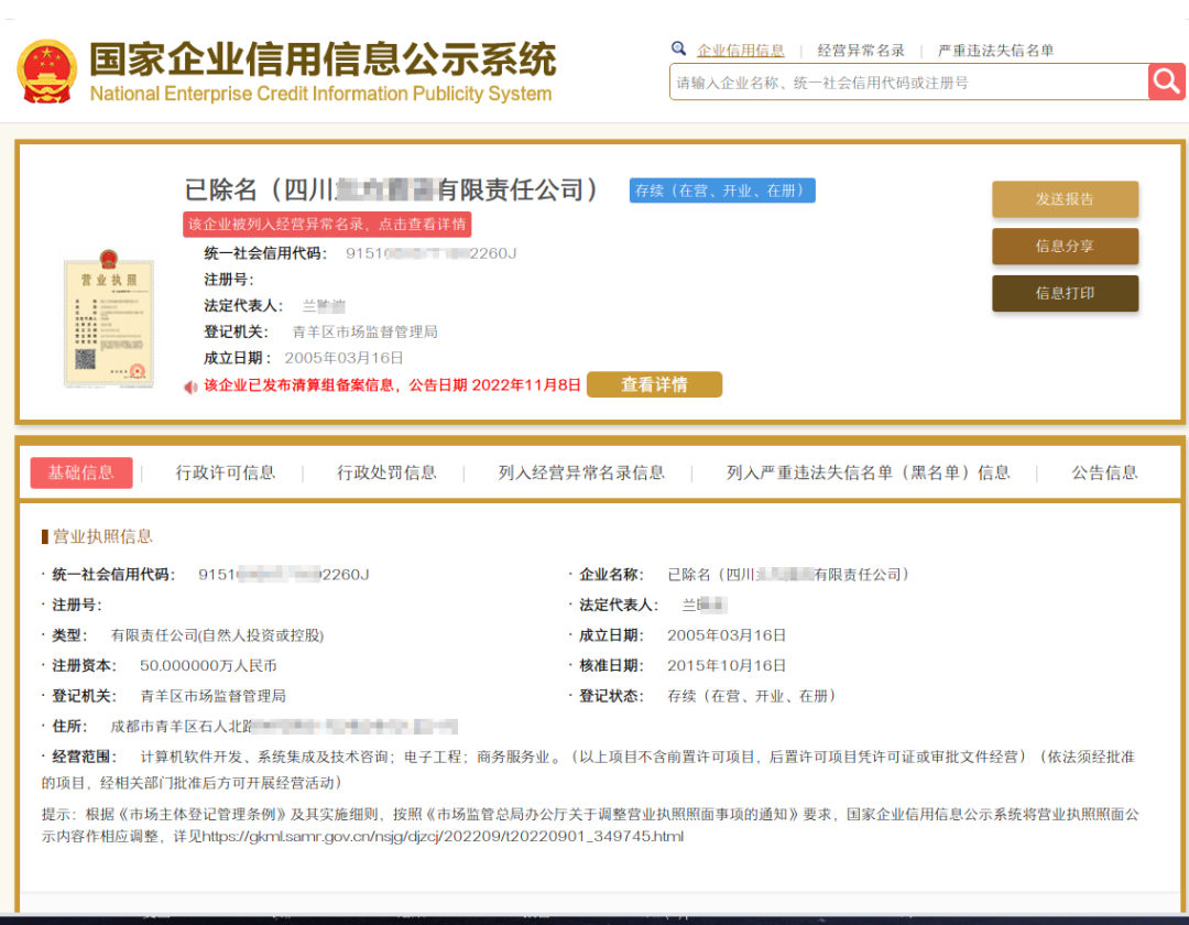 经营主体被除名后,市场监管部门将通过国家企业信用信息公示系统(四川)将其标注为“已除名”(如下图),以统一社会信用代码代替经营主体名称,向社会公众公示,约束失信主体不得从事与注销或清算无关的活动,督促其尽快修复信用记录。