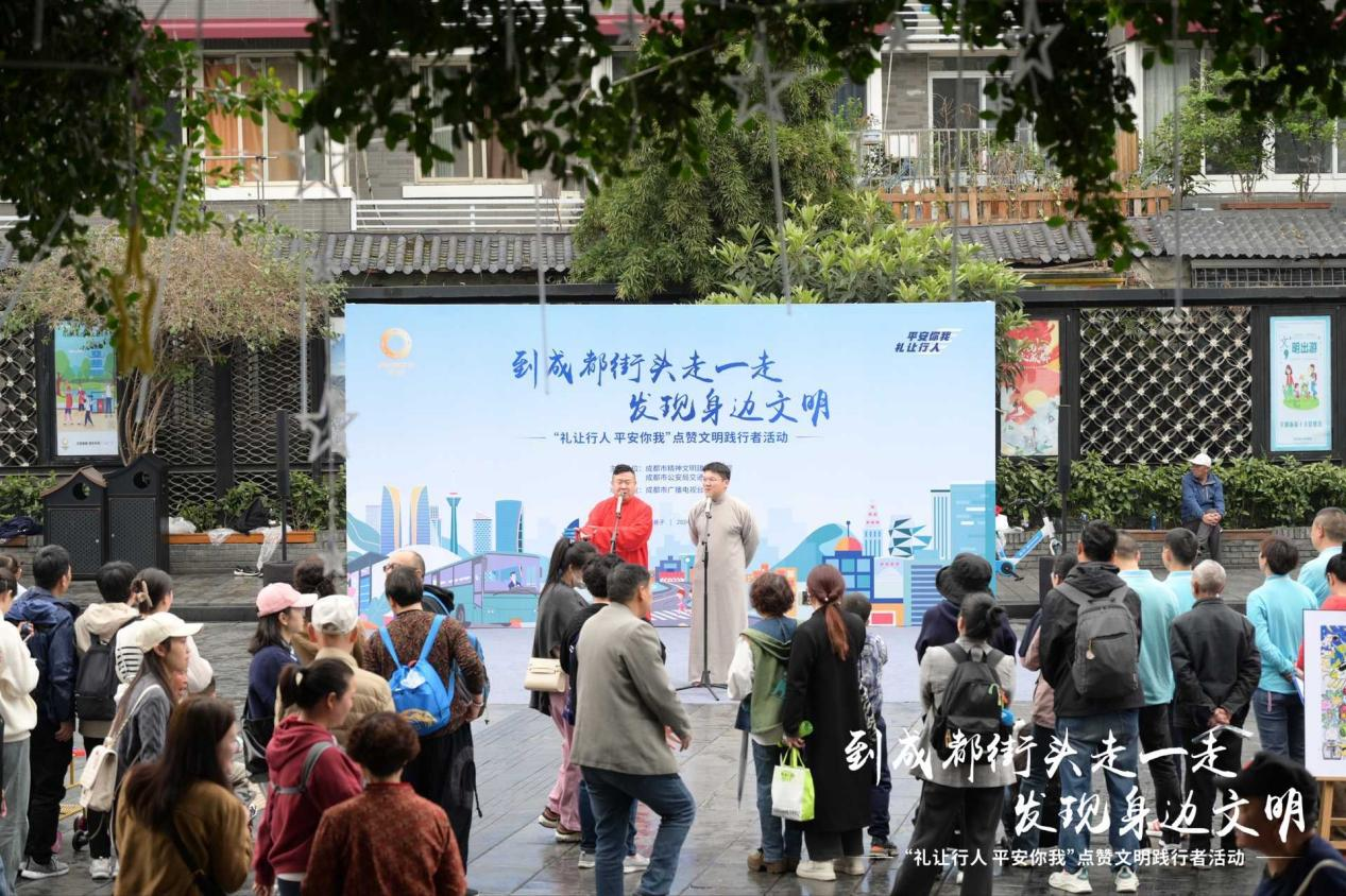遵守交规,各行其道,相互礼让,良好的交通秩序如同一面镜子,映照出一座城市的文明。4月是全市“文明月月行”系列活动“文明交通”主题月,为引导市民树立文明理念,参与文明交通,3月24日,由成都市文明办、市交管局主办、成都市广播电视台承办的“到成都街头走一走·发现身边文明”——点赞文明践行者活动在宽窄巷子东广场举行,活动聚焦“礼让行人 平安你我”主题,市民游客共同发起倡议,承诺做文明交通践行者。