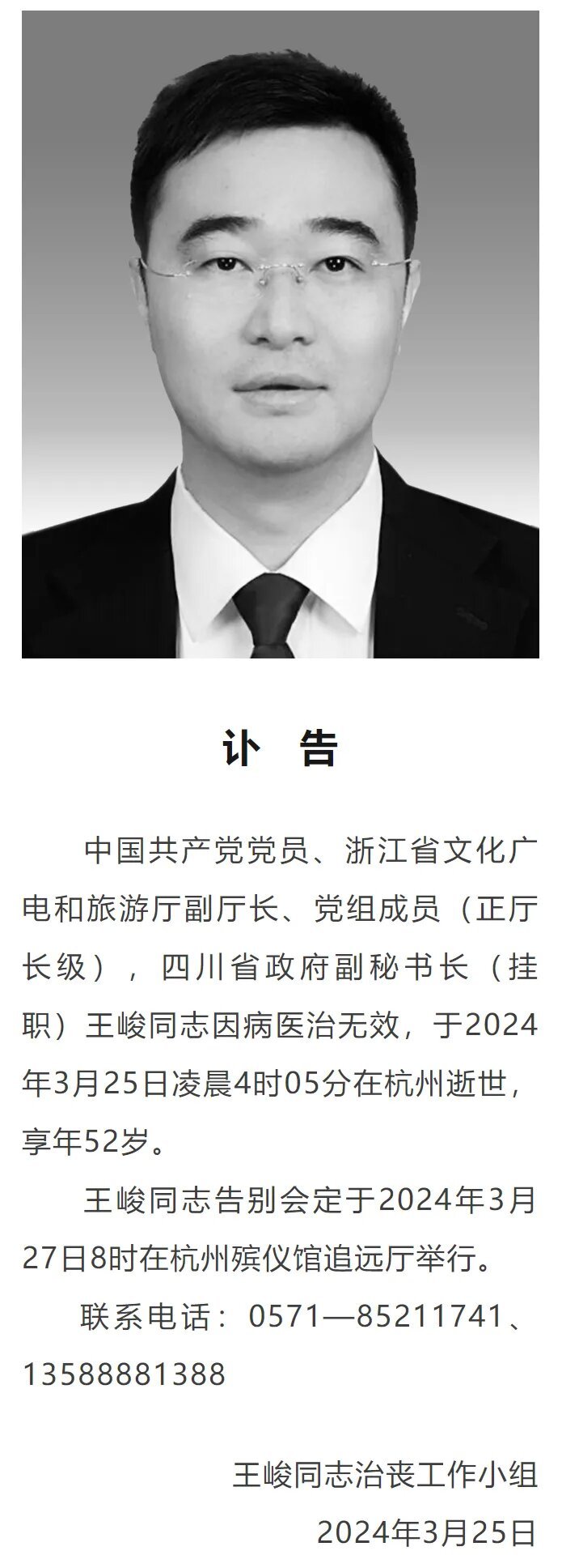 记者从王峻同志治丧工作小组方面获悉,中国共产党党员、浙江省文化广电和旅游厅副厅长、党组成员(正厅长级),四川省政府副秘书长(挂职)王峻同志,因病医治无效,于2024年3月25日凌晨4时05分在杭州逝世,享年52岁。