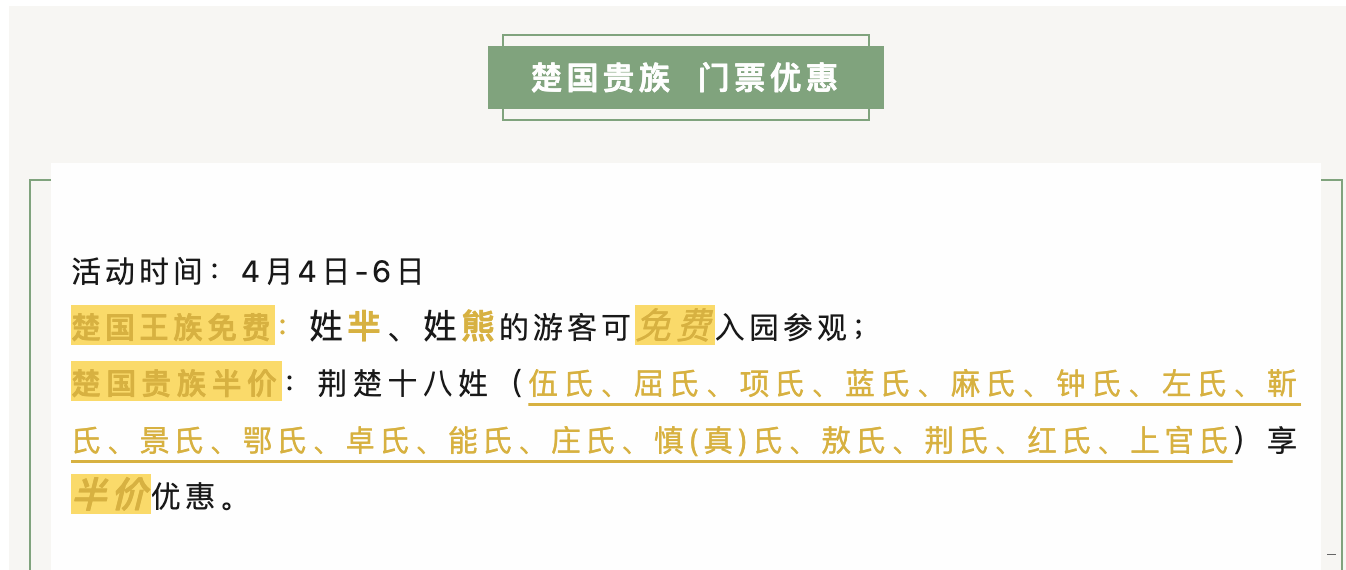 该景区发布的门票优惠政策称,4月4日至6日,楚国王族免费:姓芈、姓熊的游客可免费入园参观;楚国贵族半价:荆楚十八姓(伍氏、屈氏、项氏、蓝氏、麻氏、钟氏、左氏、靳氏、景氏、鄂氏、卓氏、能氏、庄氏、慎(真)氏、敖氏、荆氏、红氏、上官氏)享半价优惠。