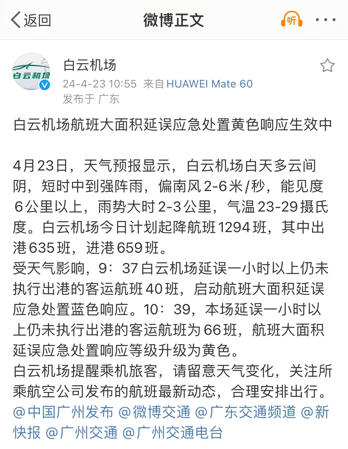 广州白云机场提醒旅客称,留意天气变化,合理安排出行。
