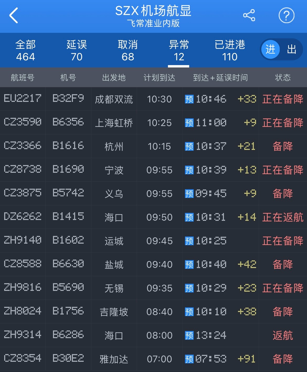多个航班正在备降和返航 广州深圳两场启动航班大面积延误预警
