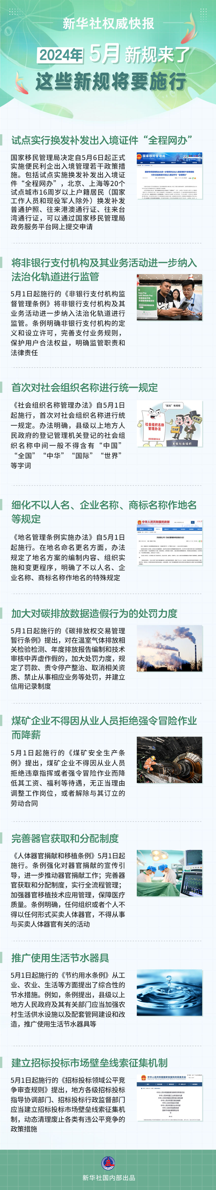 试点实行换发补发出入境证件“全程网办”、将非银行支付机构及其业务活动进一步纳入法治化轨道进行监管、首次对社会组织名称进行统一规定……这些新规5月施行,愈加完善的法治,为美好生活保驾护航。