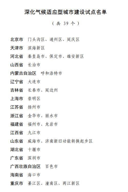 15日,生态环境部发布了深化气候适应型城市建设试点名单,天津市滨海新区、江苏省扬州市等39个市(区)入选。