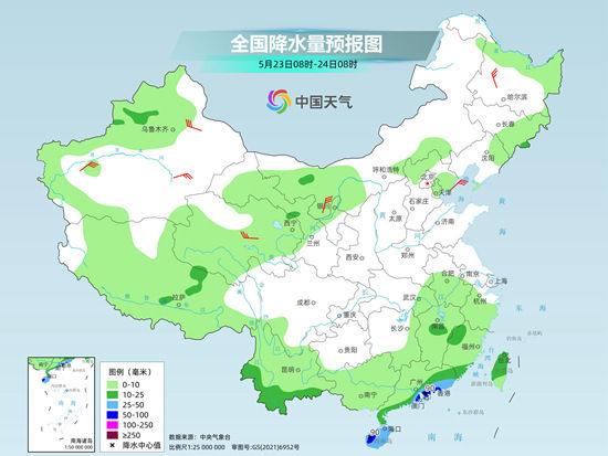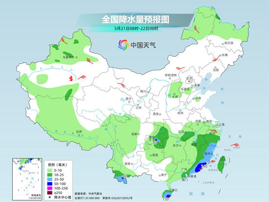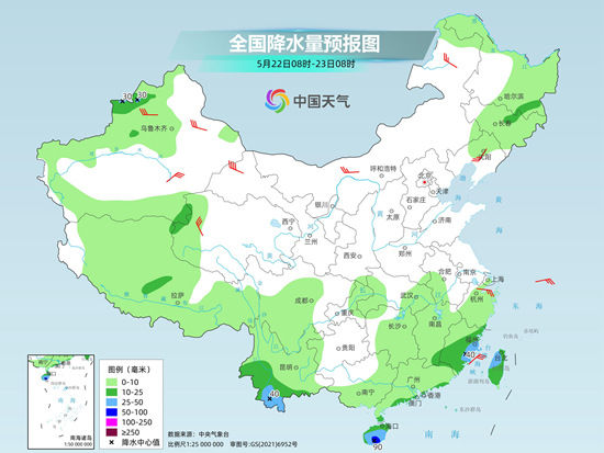 5月21日,南方强降雨过程将趋于结束,仅在海南岛东南部、广东东部沿海、福建南部沿海局地或现大暴雨。预计22日至25日,南方整体降水范围较小,强度较弱。气温方面,预计22日至24日,北方的晴热天气将再度发展增多,高温“返场”。