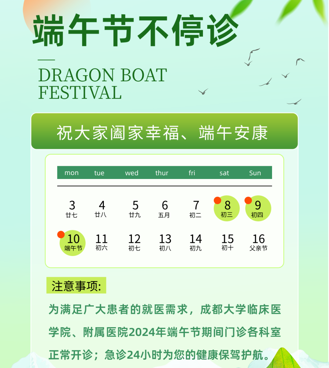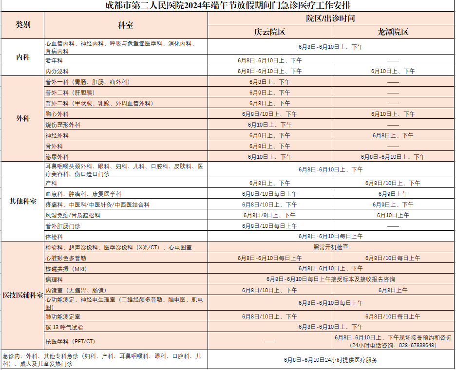 根据国家相关文件精神,结合医院实际,成都市第六人民医院2024年端午节期间门诊工作具体安排如下: