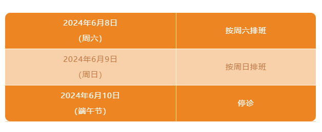 2024年6月8日(星期六)至6月10日(星期一)全天门诊。