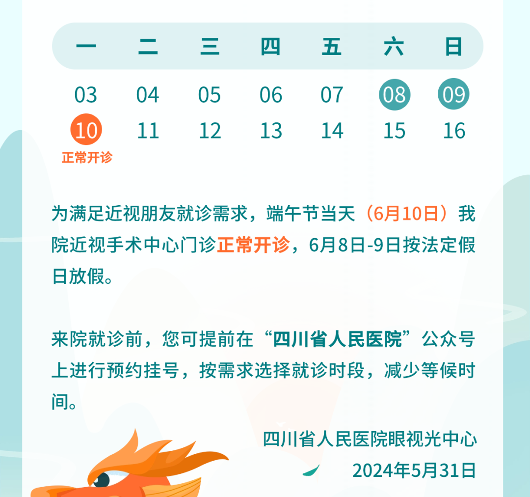 2024年端午节期间四川省人民医院近视手术中心门诊安排如下: