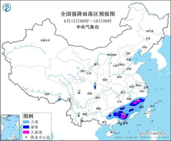 中央气象台6月15日06时继续发布暴雨黄色预警:预计,6月15日08时至16日08时,广西东北部、广东中北部和西南部沿海、湖南南部、江西南部和东部、福建大部、浙江南部以及云南南部、四川盆地北部等地部分地区有大到暴雨,其中,福建西北部、广东中部和西北部、广西东北部等地部分地区有大暴雨(100~200毫米)。上述部分地区伴有短时强降水(最大小时降雨量30~50毫米,局地可超过70毫米),局地有雷暴大风等强对流天气。