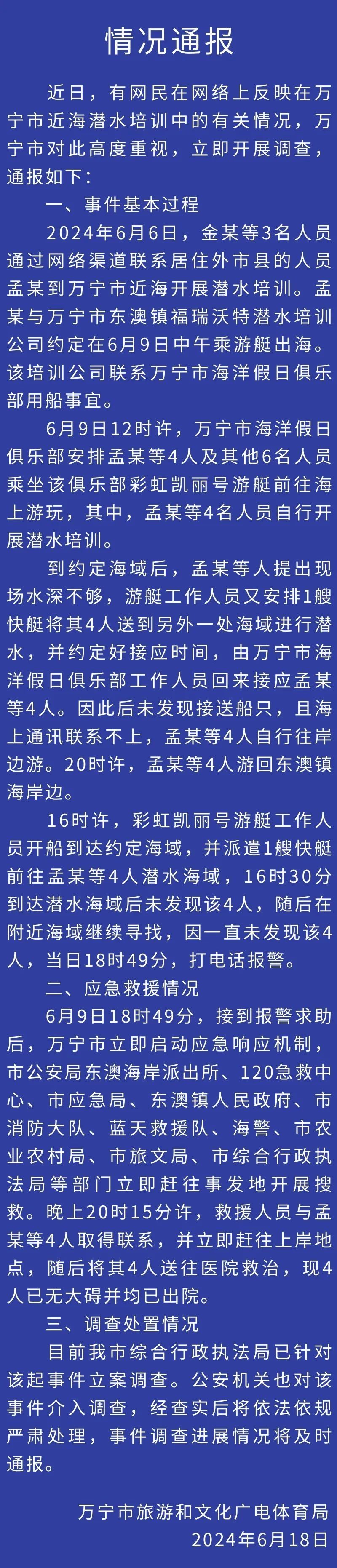 6月18日,海南万宁市旅游和文化广电体育局微信公众号“万宁旅文”就网络上反映在万宁市近海潜水培训中的有关情况发布通报。全文如下: