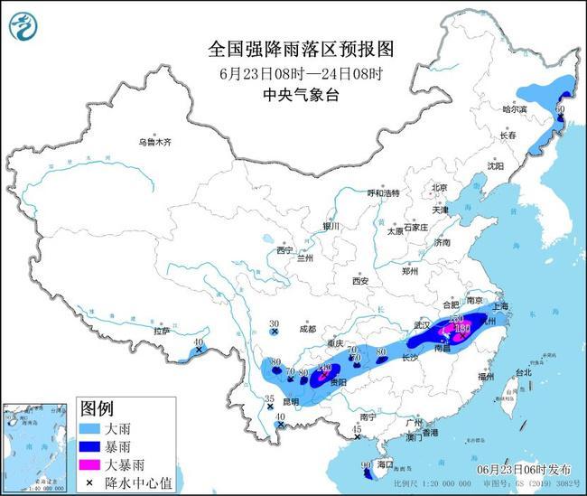 预计,6月23日8时至24日8时,安徽南部、上海、浙江中北部、江西中北部、福建西北部、湖北东南部、湖南中北部、贵州大部、云南东北部、四川南部,以及黑龙江东部、吉林东部、海南岛西部等地部分地区有大到暴雨,其中,安徽南部、江西北部、浙江西部、贵州中北部等地部分地区有大暴雨(100~150毫米)。上述部分地区伴有短时强降水(最大小时降雨量30~50毫米,局地可超过80毫米),局地有雷暴大风等强对流天气。