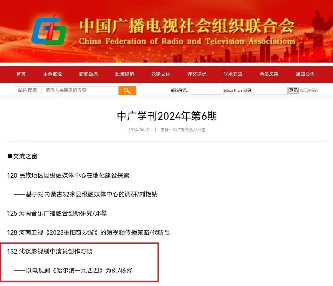经查询,国家广电总局主管、中国广播电视社会组织联合会主办的学术期刊《中国广播电视学刊》(CSSCI扩展版、北大中文核心)在2024年第六期发表了一篇名为《浅谈影视剧中演员创作习惯——以电视剧<哈尔滨一九四四>为例》的文章,署名为“杨幂”。