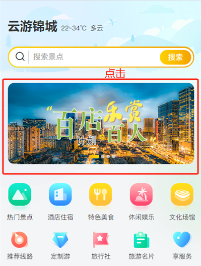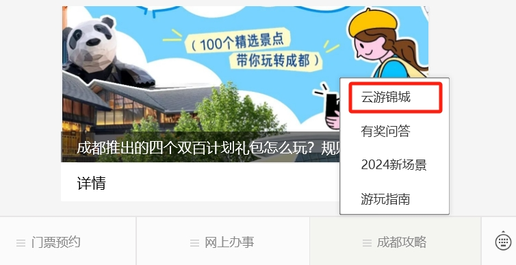 1.打开微信,搜索“文旅成都”微信公众号,在底部导航栏选择【成都攻略】进入“云游锦城”小程序,也可点击下图直接进入,进入后点击最上方活动图片,即可查看场馆预约页面。
