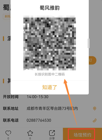 2.点击“场馆预约”,“长按识别图中二维码”跳转至预约平台进行演出预约。