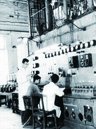 张存浩(左一)在实验室进行水煤气合成液体燃料实验。
