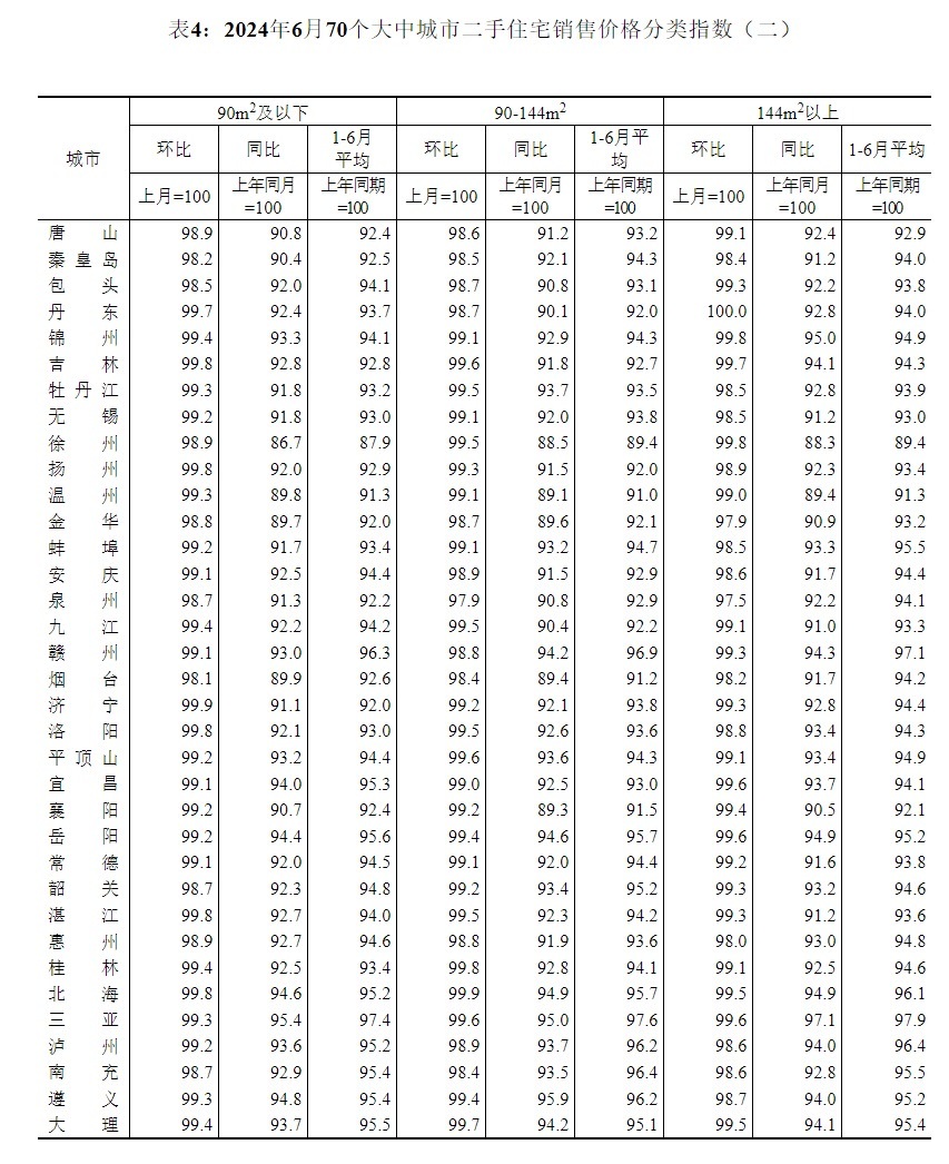 2024年6月份,70个大中城市中,各线城市商品住宅销售价格环比降幅总体收窄;同比下降,其中一线城市二手住宅同比降幅收窄