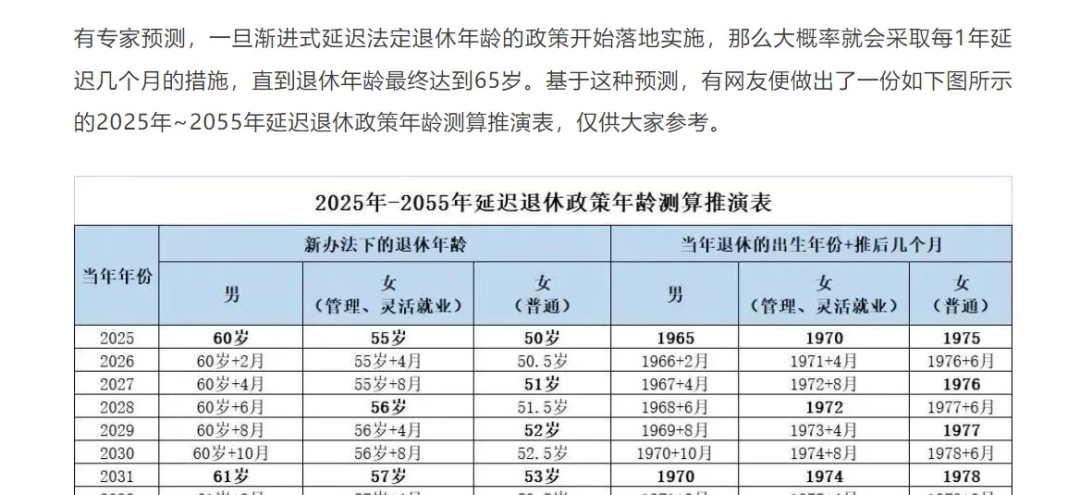 记者了解到,“1990年之后(含1990年)出生的人员,不论男女都将调整为65岁退休”说法来自于一张《退休年龄对照表及相关规定》和《2025年-2055年延迟退休政策年龄测算推演表》,而这个表格则是网友基于部分专家“采取每1年延迟几个月的措施,直到退休年龄最终达到65岁”的预测做出的测算推演表,该说法并没有官方信息佐证。