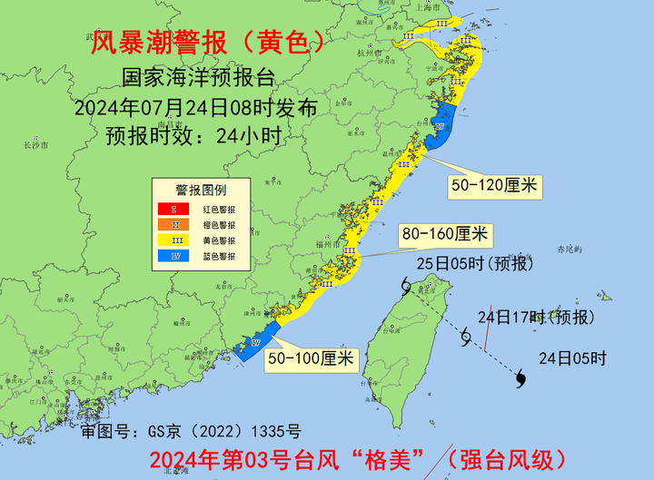 国家海洋预报台根据《海洋灾害应急预案》,发布风暴潮黄色警报。受今年第3号台风“格美”(强台风级)影响,预计:7月24日上午至25日上午,杭州湾至浙江温州沿海将出现50到120厘米的风暴增水,福建宁德至莆田沿海将出现80到160厘米的风暴增水,福建泉州至漳州沿海将出现50到100厘米的风暴增水。上海市、浙江省嘉兴市、绍兴市、宁波市、舟山市、温州市、福建省宁德市、福州市、莆田市、泉州市和厦门市的风暴潮预警级别为黄色,浙江省台州市和福建省漳州市的风暴潮预警级别为蓝色。请沿海政府及相关部门按照职责做好防御风暴潮的应急准备工作;各涉海相关生产单位采取积极有效的措施,组织渔船、养殖渔排、养殖场等做好防御工作;加固沿海渔业养殖水产设施和渔港设施,做好防潮准备。