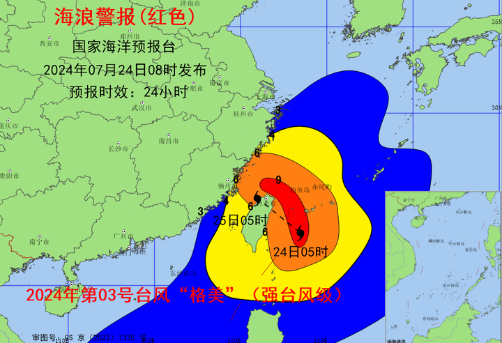 国家海洋预报台根据《海洋灾害应急预案》发布海浪红色警报。受今年第3号台风“格美”(强台风级)的影响,预计:7月24日中午到25日中午,东海南部、台湾以东洋面将出现6到10米的狂浪到狂涛区,台湾海峡将出现4到7米的巨浪到狂浪区,近海海域海浪预警级别为橙色;浙江南部、福建北部近岸海域将出现4到6米的巨浪到狂浪,该近岸海域海浪预警级别为红色,浙江北部近岸海域将出现3到5米的大浪到巨浪,该近岸海域海浪预警级别为橙色,福建南部近岸海域将出现3到4米的大浪到巨浪,该近岸海域海浪预警级别为黄色。请在上述海域作业的船只注意安全,沿海各有关单位提前采取防浪避浪措施。