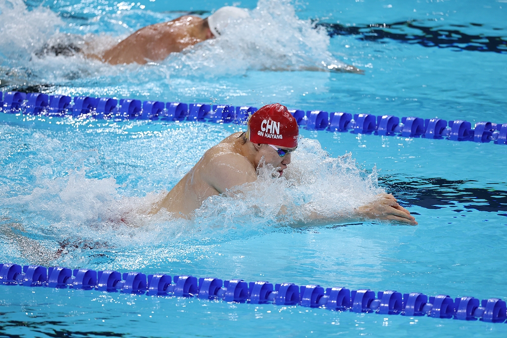 在男子100米蛙泳的比赛中,覃海洋以预赛第9名挺进半决赛,孙佳俊无缘晋级。随后的半决赛中,覃海洋游出58秒93,以小组头名的成绩晋级决赛。