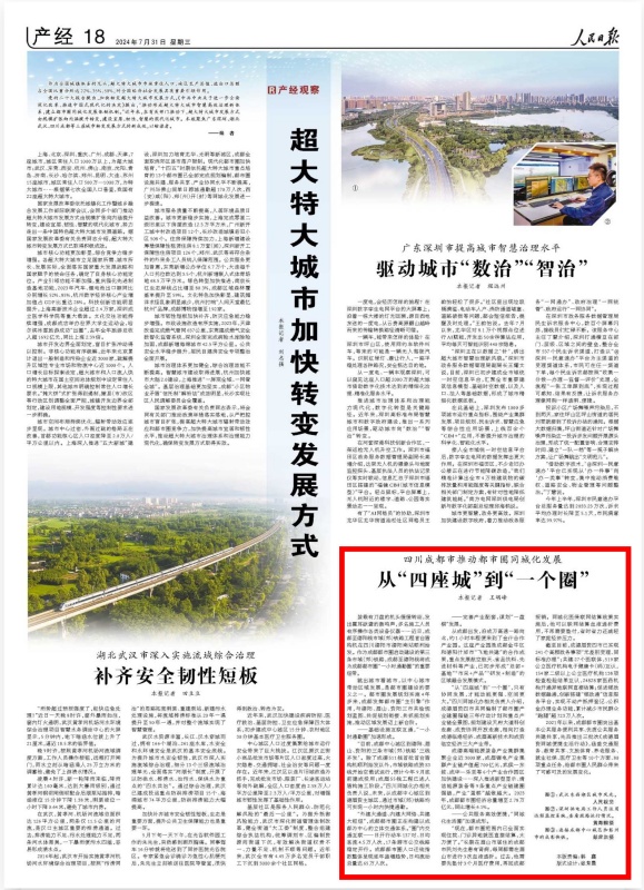 7月31日,人民日报刊发报道《四川成都市推动都市圈同城化发展 从“四座城”到“一个圈”》,对近年来成都都市圈建设的成绩进行了报道,全文如下: