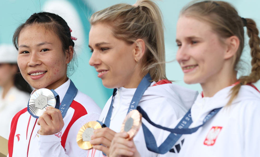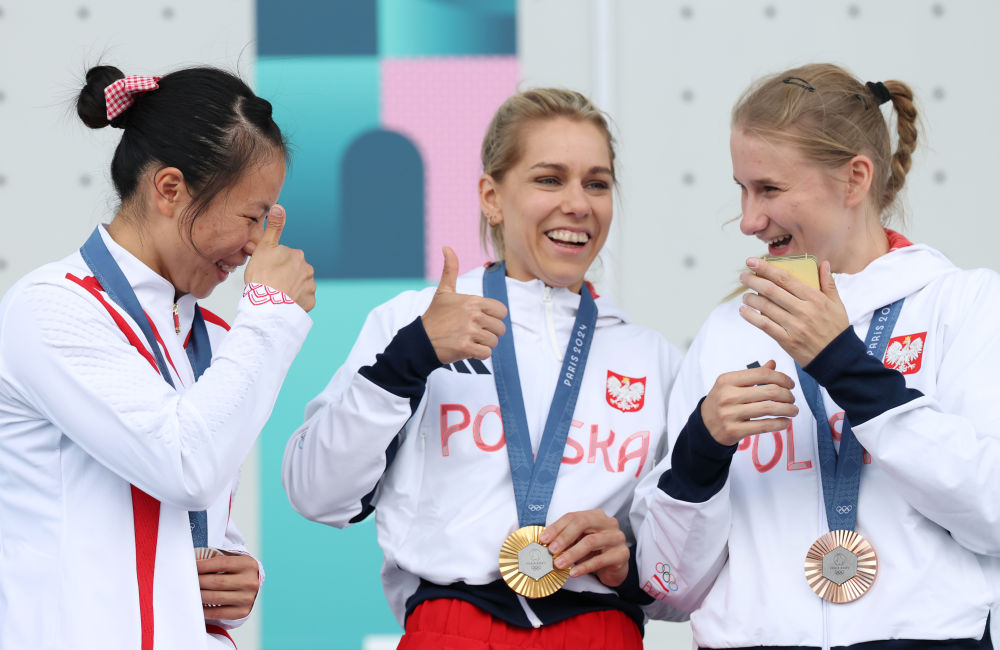 亚军中国选手邓丽娟(左)、冠军波兰选手米罗斯瓦夫(中)与季军波兰选手卡乌茨卡在颁奖仪式上。