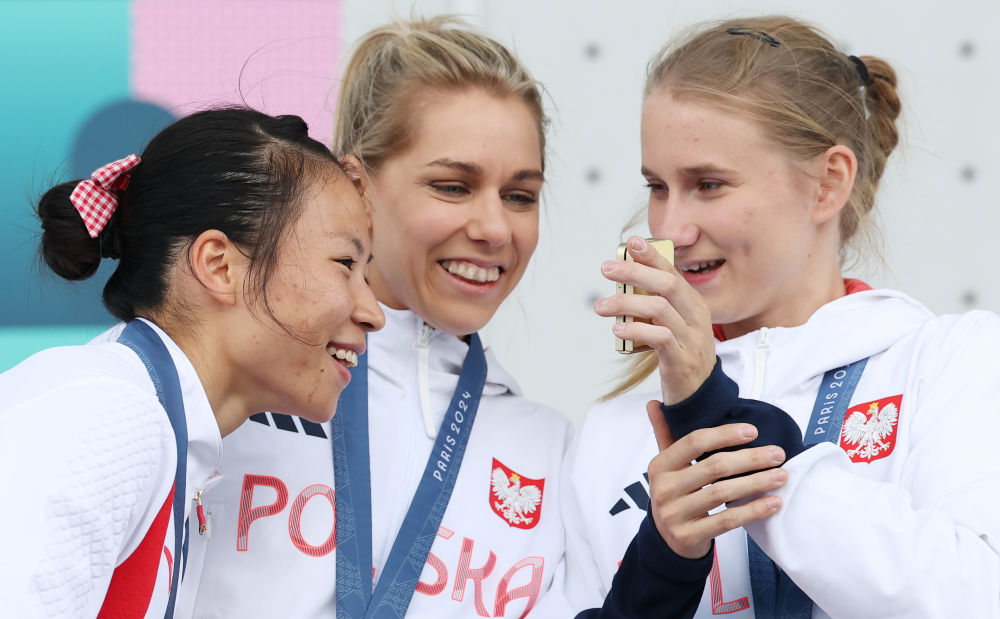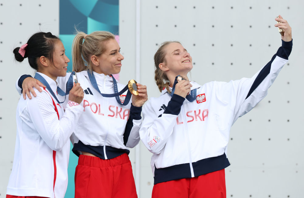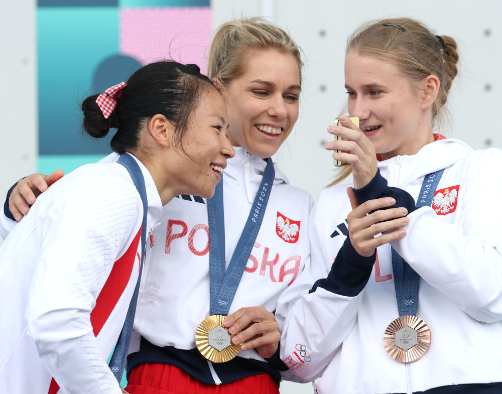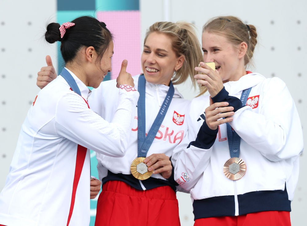 亚军中国选手邓丽娟(左)、冠军波兰选手米罗斯瓦夫(中)与季军波兰选手卡乌茨卡在颁奖仪式上合影。