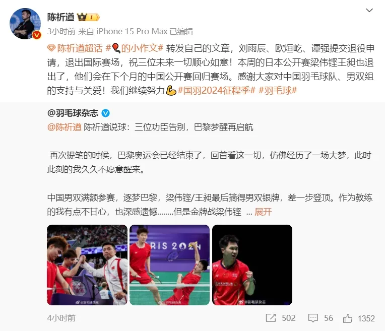 8月19日下午,中国羽毛球队教练员陈祈遒发布微博称,刘雨辰、欧烜屹、谭强提交退役申请,退出国际赛场。