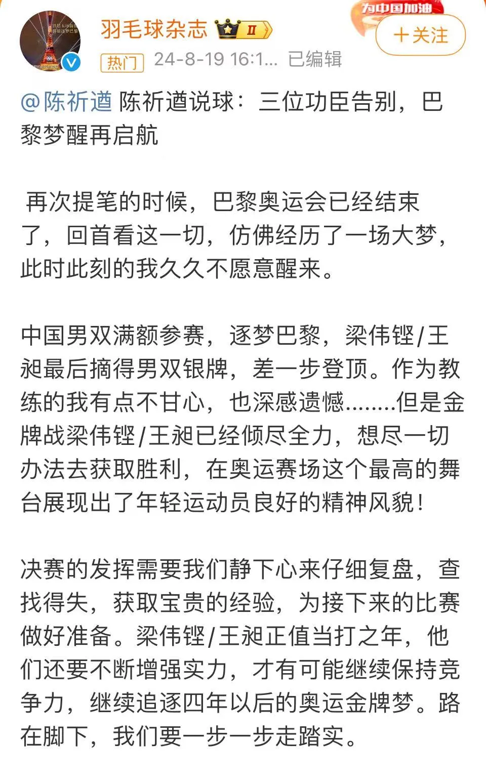 除了与3位功臣告别,陈祈遒表示,在巴黎奥运会上梁伟铿/王昶最后摘得男双银牌,差一步登顶,“作为教练的我有点不甘心,也深感遗憾……但是金牌战梁伟铿/王昶已经倾尽全力,想尽一切办法去获取胜利,在奥运赛场这个最高的舞台展现出了年轻运动员良好的精神风貌!”