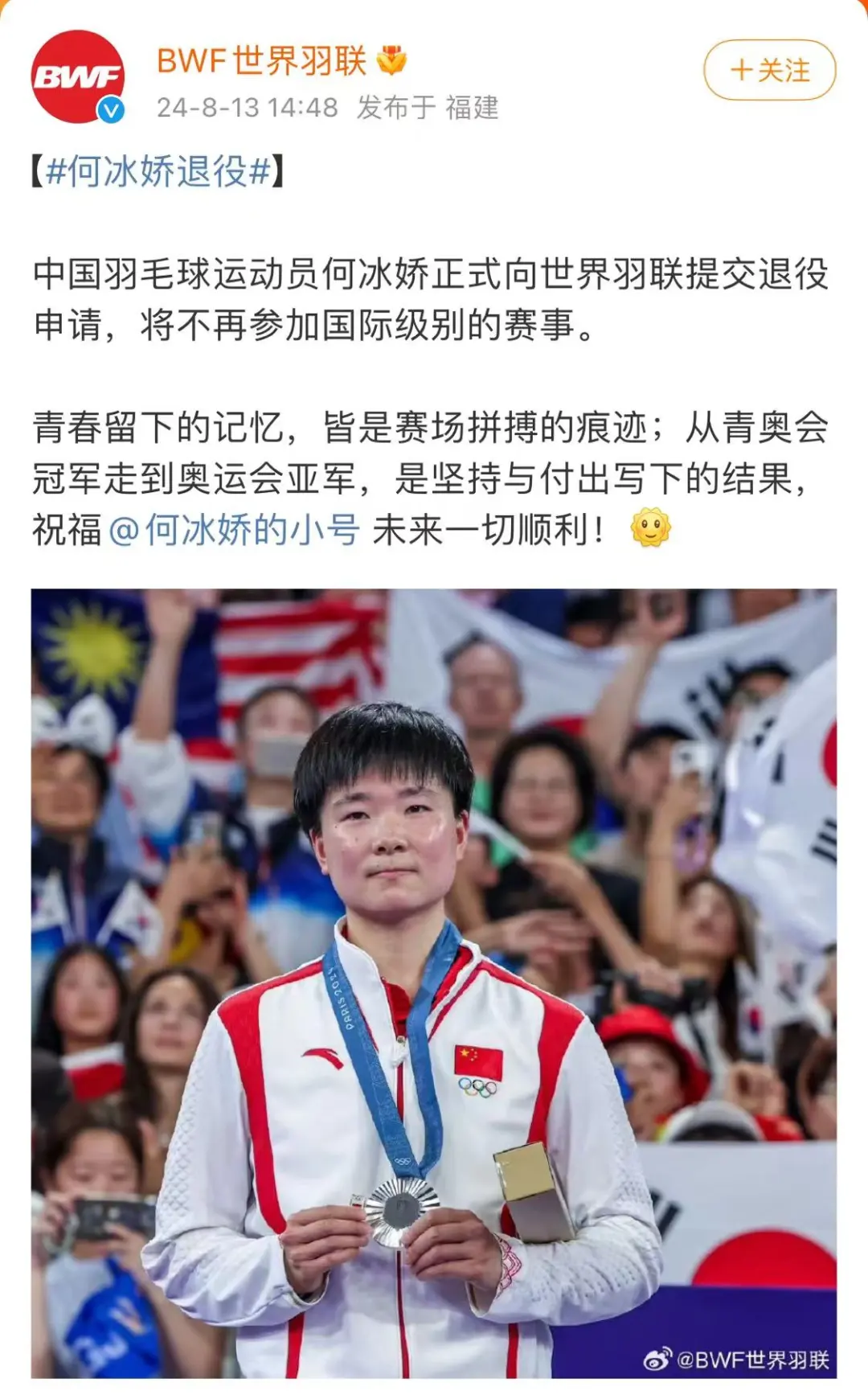 此前,8月13日,根据世界羽联官方微博消息,中国羽毛球运动员何冰娇正式向世界羽联提交退役申请,将不再参加国际级别的赛事。