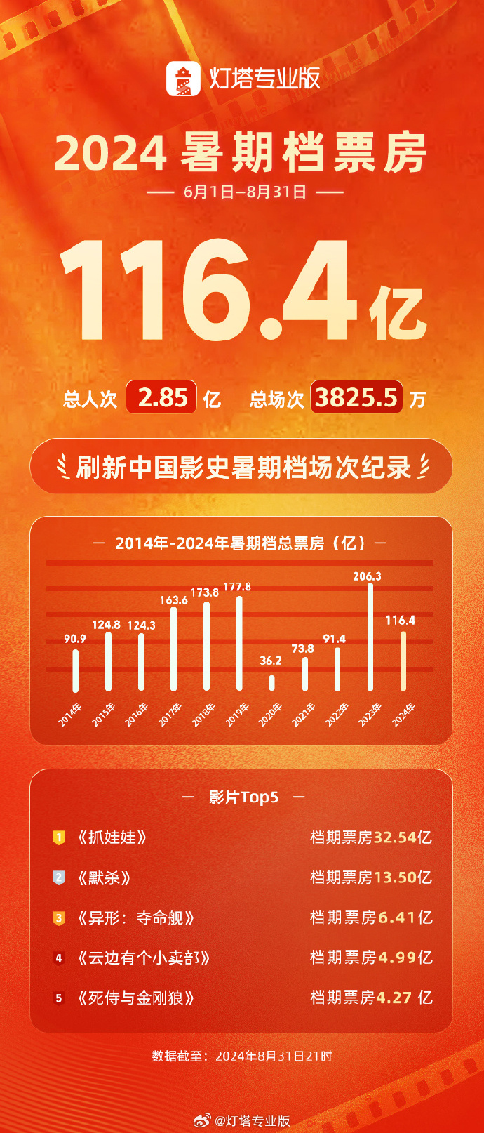 2024暑期档票房116.4亿!《抓娃娃》获票房冠军