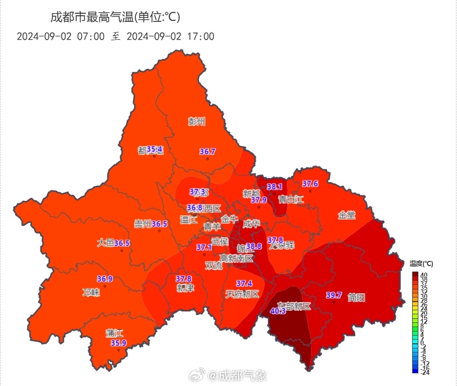 截至17时,我市最高气温40.3℃,出现在东部新区,全市最高气温平均值为37.5℃。根据最新气象资料分析,未来三天高温天气过程持续,高温区域主要位于我市中心城区及以东区域,日最高气温36~38℃,东部新区和简阳可达39℃。同时,午后到夜间都易发局地强对流天气。