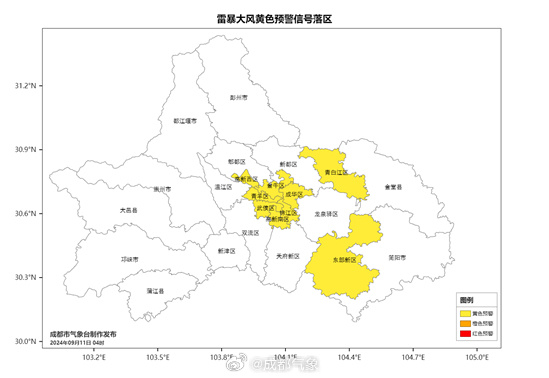 4时10分,成都市气象台继续发布雷暴大风黄色预警信号:我市锦江区、青羊区、金牛区、武侯区、成华区、高新西区、东部新区、高新南区、青白江区的所有镇(街道)6小时内将出现雷暴大风天气,阵风可达8级以上,并伴有强雷电和短时强降雨,局部地方大到暴雨。