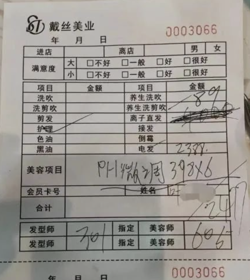 烫发结束后,发型师告知其“398元”并非总价,而是单支药水的价格,而整个烫发过程他共使用了6支药水。一张印有“戴丝美业”的收费单据显示,叶先生的项目为“PH微调398x6”,加上洗剪吹项目89元,费用总计2477元。
