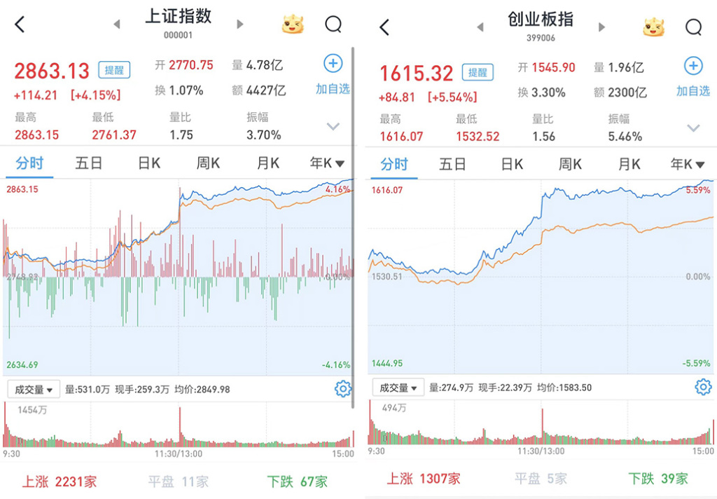 至收盘,上证综指涨4.15%,报2863.13点,创2020年7月6日以来的最大单日涨幅;科创50指数涨3.73%,报667.05点;深证成指涨4.36%,报8435.7点;创业板指涨5.54%,报1615.32点。