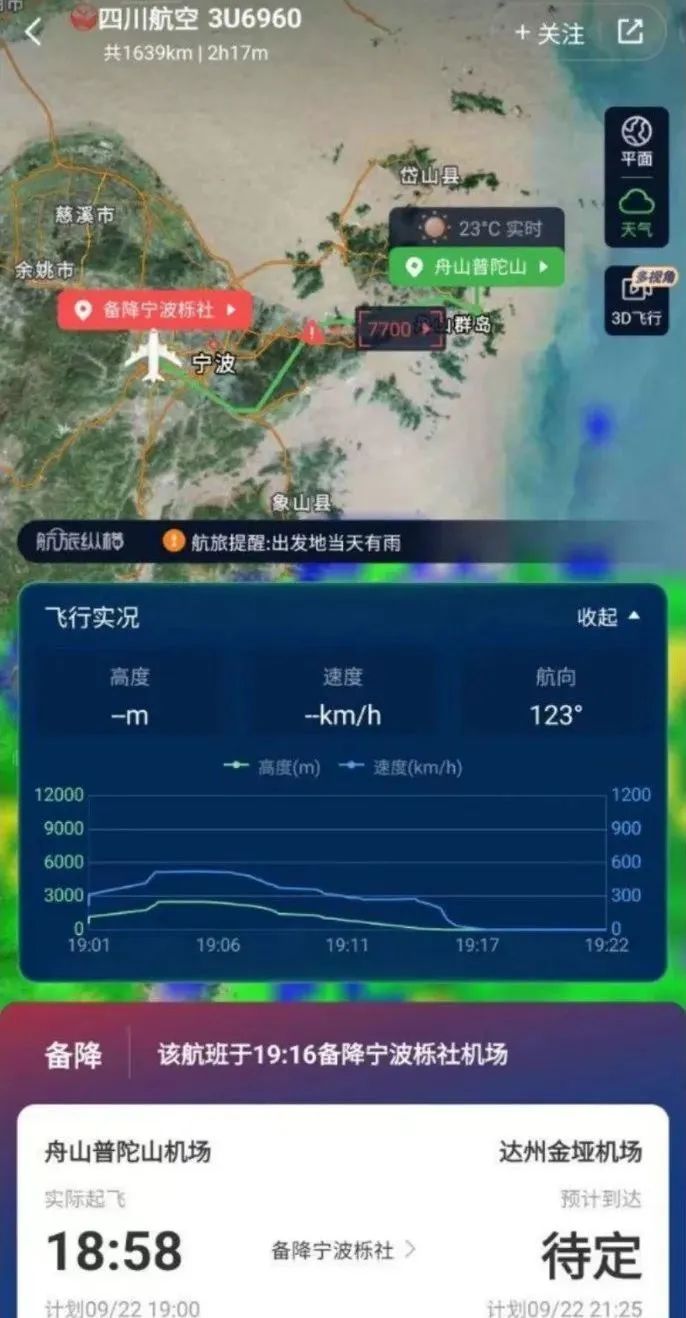 9月22日晚,由浙江舟山飞往成都的川航3U6960航班起飞后不久在大榭岛附近挂出7700紧急代码,紧急备降宁波。