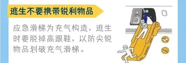 应迅速将眼镜、高跟鞋等褪去,防止落地时戳伤自己。当逃离机舱时,这些物品也可能会戳破逃生滑梯,影响逃生速度。