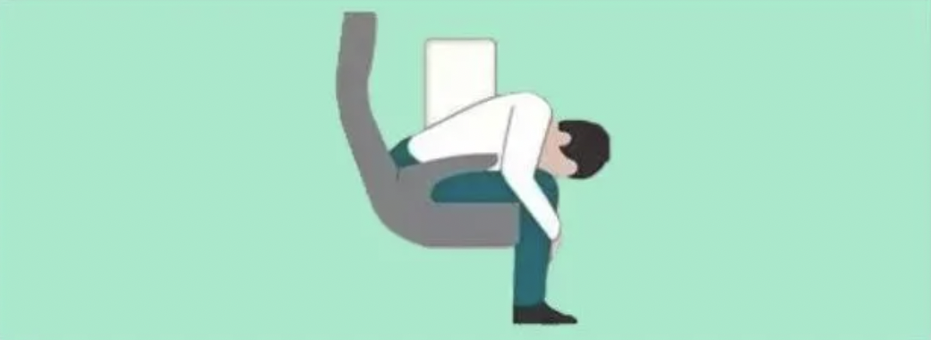 飞机坠地时,会产生巨大冲击力,应提前做好准备姿势:小腿尽量向后收,超过膝盖垂线以内;头部向前倾,尽量贴近膝盖。