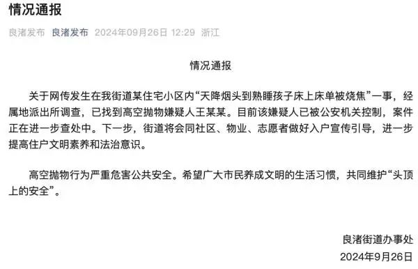 9月26日,据杭州余杭区良渚街道办事处官方微信公号“良渚发布”通报:关于网传发生在我街道某住宅小区内“天降烟头到熟睡孩子床上床单被烧焦”一事,经属地派出所调查,已找到高空抛物嫌疑人王某某。目前该嫌疑人已被公安机关控制,案件正在进一步查处中。下一步,街道将会同社区、物业、志愿者做好入户宣传引导,进一步提高住户文明素养和法治意识。