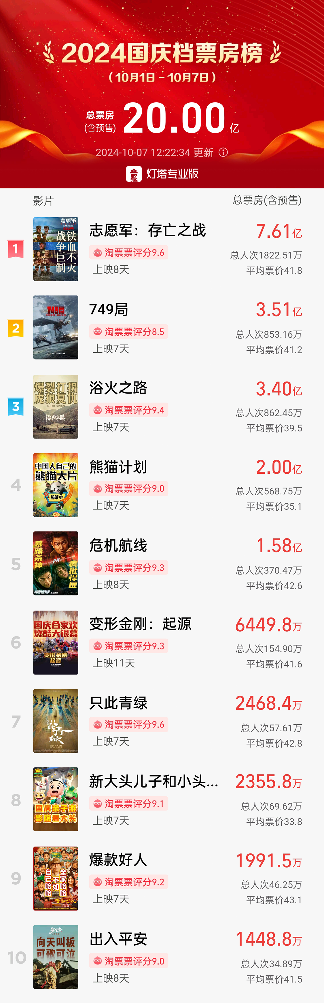 据网络平台数据,截至10月7日12时22分,2024年国庆档(10月1日—10月7日)档期总票房突破20亿。