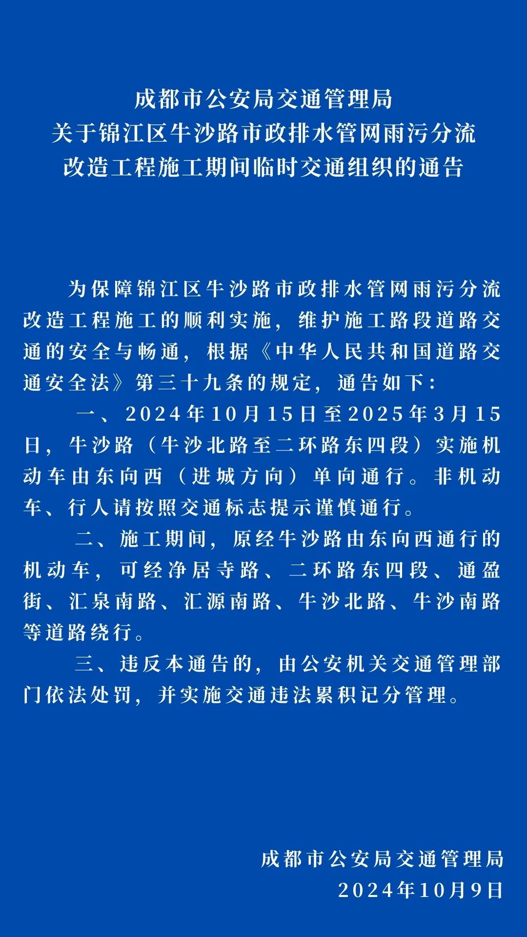 关于锦江区牛沙路市政排水管网雨污分流改造工程施工期间临时交通组织的通告
