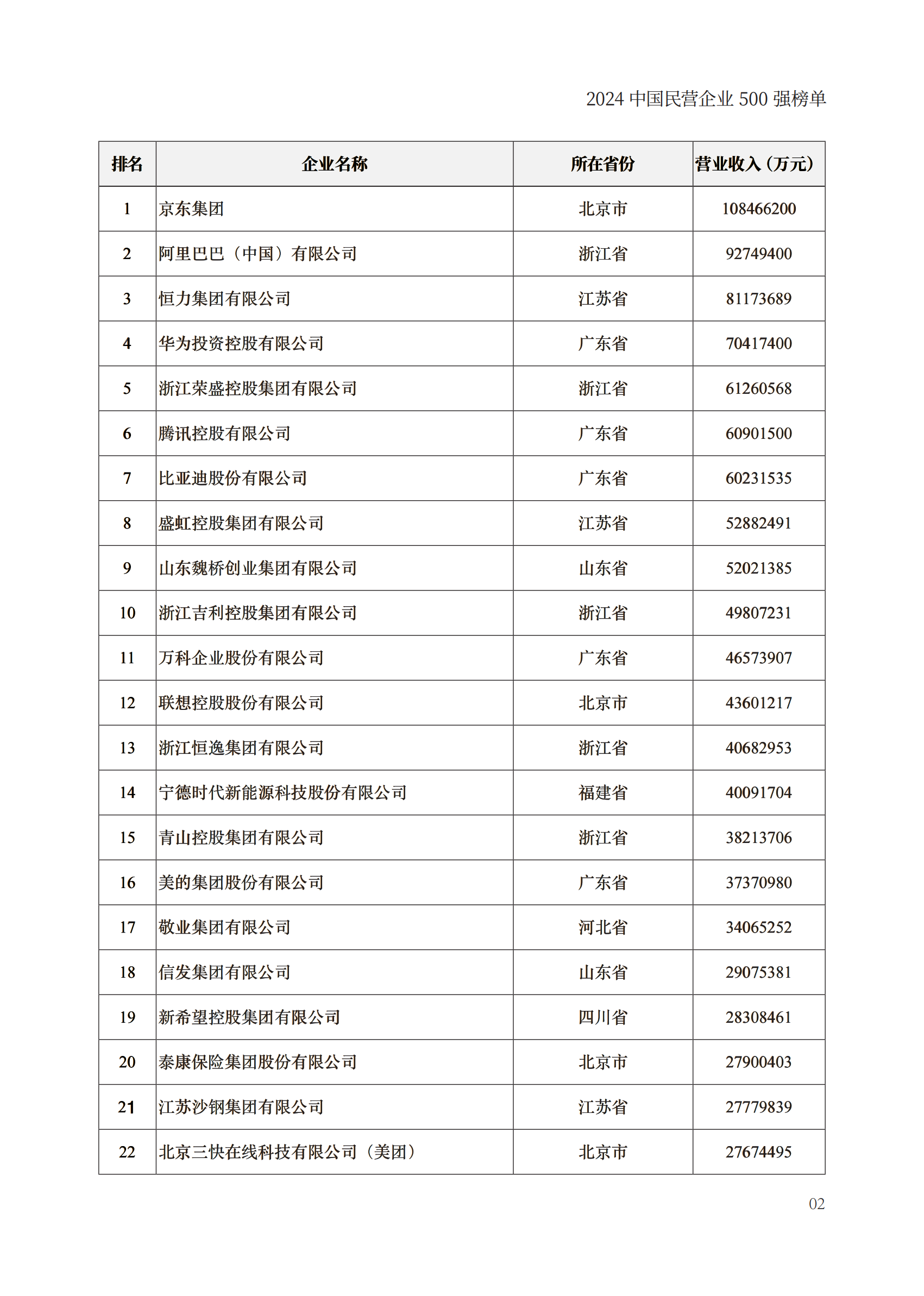 2024中国民营企业500强发布,京东阿里恒力列前三