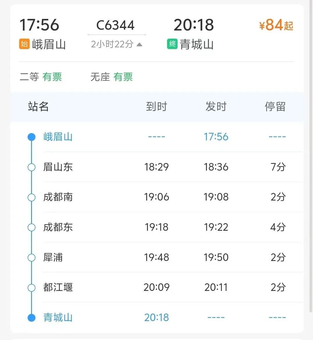 峨眉山→青城山C6344次列车:峨眉山站始发,途经眉山东、成都南、成都东、犀浦、都江堰,终到青城山站。