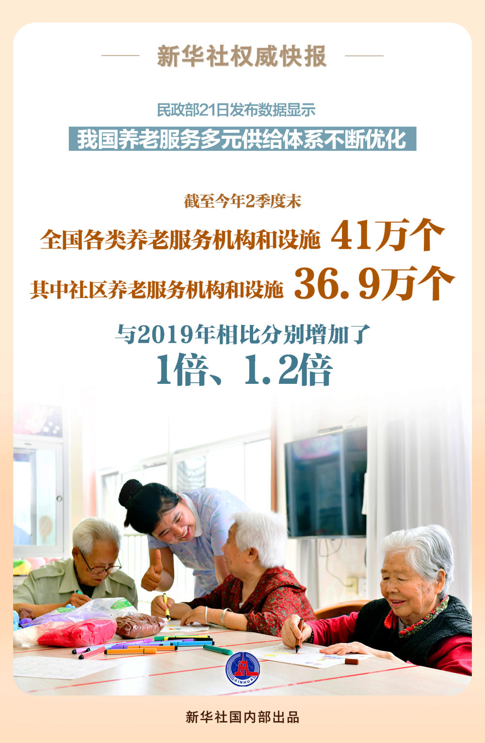 记者10月21日从民政部获悉,近年来,我国养老服务多元供给体系不断优化,居家社区养老服务加快发展。截至今年2季度末,全国各类养老服务机构和设施41万个,其中社区养老服务机构和设施36.9万个,与2019年相比分别增加了1倍、1.2倍。
