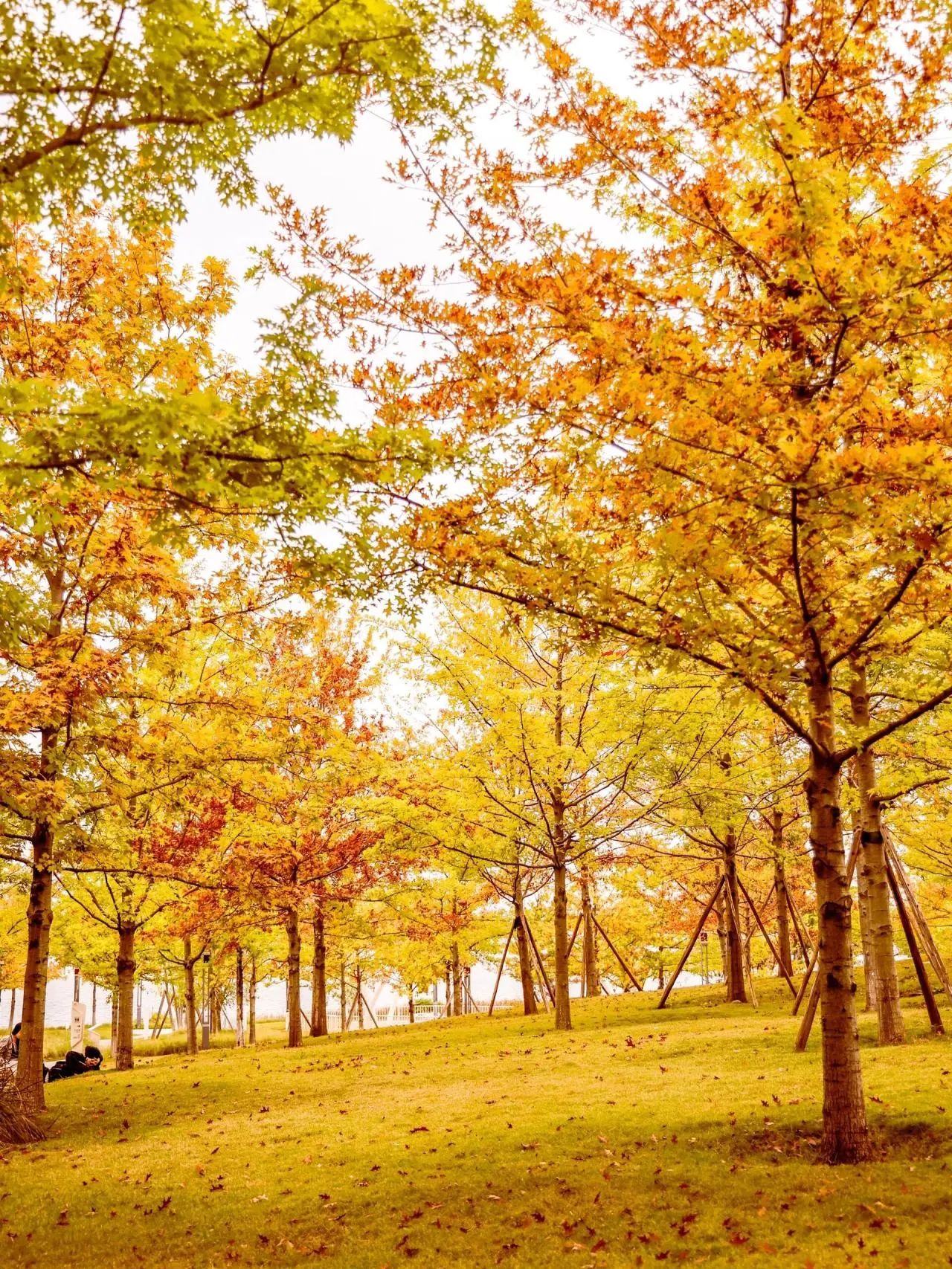 湖面倒影里涂上了一片片明艳温暖暖色调,令人过目不忘。树叶在枝头明晃晃的摇摇欲坠着,又或在空中旋转翻滚翩然起舞着。