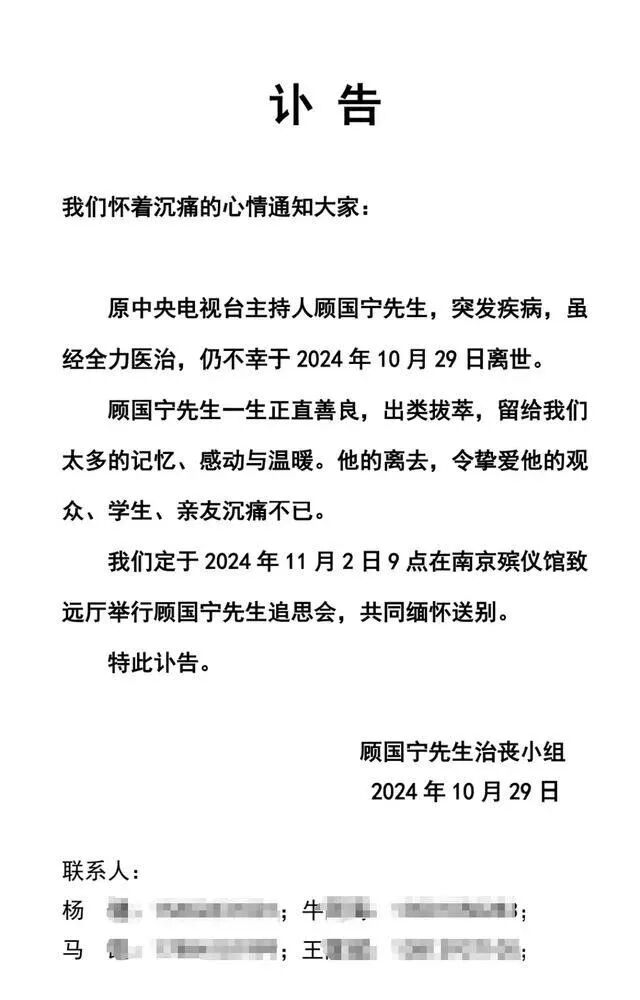 讣告显示,顾国宁追思会定于2024年11月2日9点,在南京殡仪馆致远厅举行。