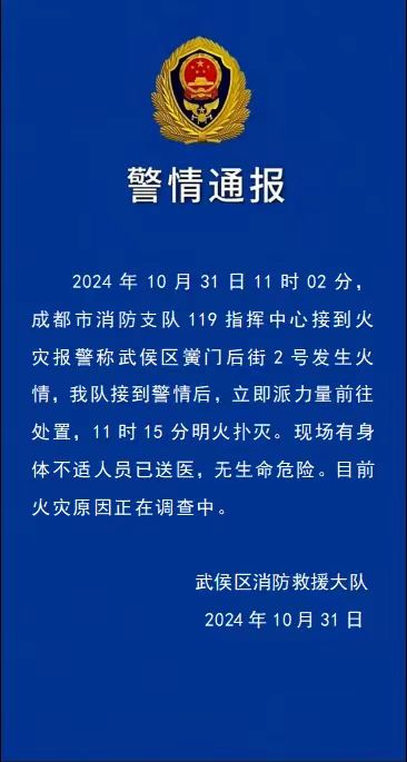 成都武侯区消防救援大队消息,2024年10月31日11时02分,成都市消防支队119指挥中心接到火灾报警称武侯区黉门后街2号发生火情,该队接到警情后派力量前往处置,11时15分明火扑灭。现场有身体不适人员已送医,无生命危险。目前火灾原因正在调查中。