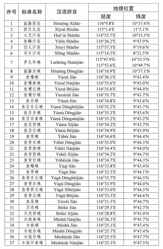 为进一步规范有关地名的使用,现将我国南海部分岛礁标准名称予以公布。中国地名委员会1983年4月受权公布的《我国南海诸岛部分标准地名》和自然资源部、民政部2020年4月公布的《自然资源部 民政部关于公布我国南海部分岛礁和海底地理实体标准名称的公告》继续有效,请社会各界规范使用已公布的标准名称。