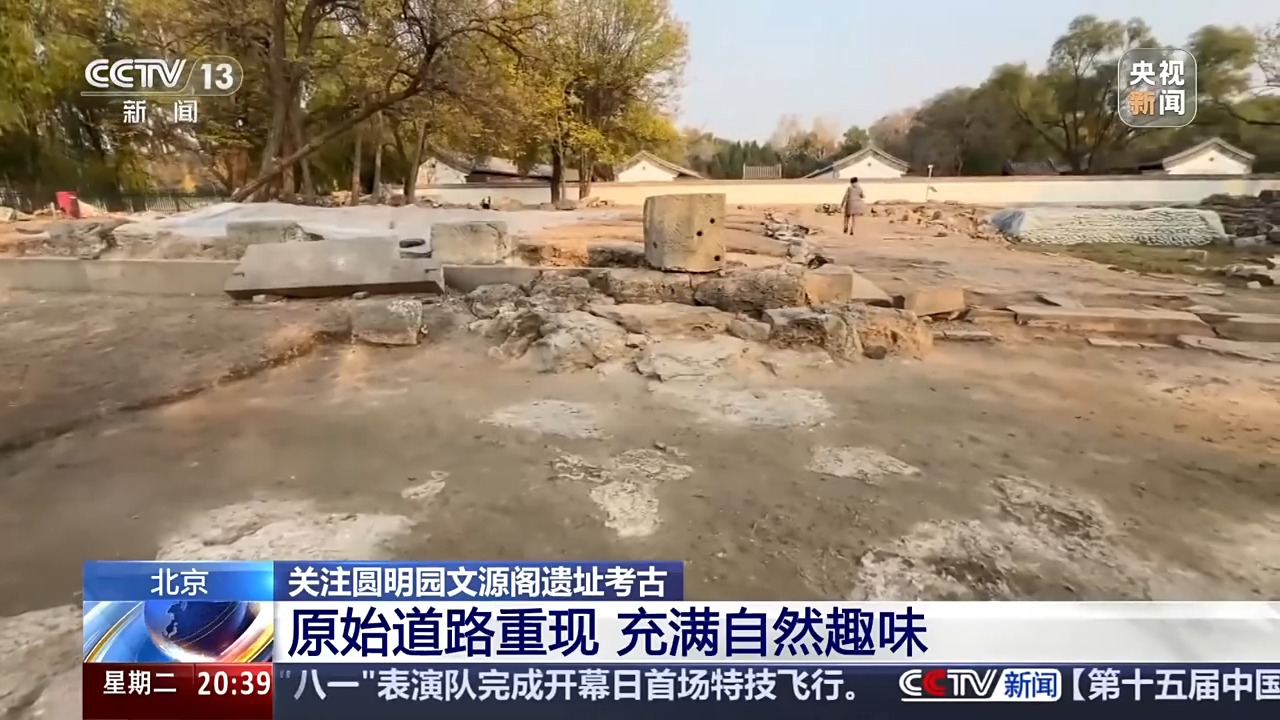 总台记者 王胜东:这是文源阁院落内之前的地面,经过一段时间的考古发掘之后,工作人员向下打通了大约半米,让文源阁内原始的路面重见天日。我们可以看到在路面上有大量的不规则的这些石块,由它们构成了整个文源阁院落内的道路系统,从我现在所在的位置向南,可以抵达假山,还有月台、趣亭以及宫门等地,那么向北可以到达碑亭还有藏书楼以及藏书楼的后门。