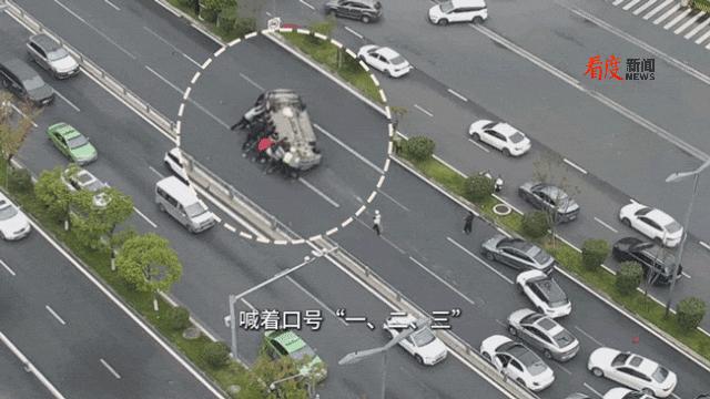 当日下午2时19分,现场处置民警许明生喊了一声:“请大家帮下忙!”话音刚落,路过的、围观的十多名市民已经小跑到了仰翻车辆前面,大家喊着口号“一、二、三”,一起使劲,十多秒的时间,就把四轮朝天的汽车“掀”正,又齐心协力推到拖车面前。随后,拖车将车辆拖离,事故现场很快恢复交通。……从发现事故到恢复交通,八分钟不到。